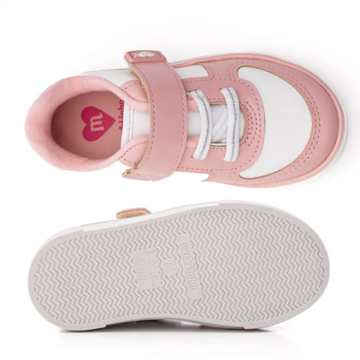 Para um look casual e charmoso, combine o tênis Molekinha com um vestido jeans leve e uma jaqueta rosa claro. Adicione uma tiara delicada e uma mochilinha branca. Ideal para passeios, aniversários ou um dia no parque, esse visual une conforto, praticidade e muito estilo para a menina arrasar em qualquer ocasião com alegria.